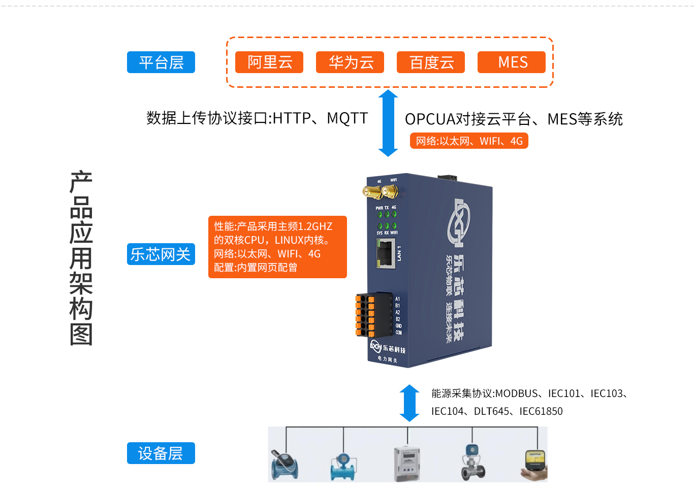 连接水、电、气、热等能源设备和PLC,支持Modbus、IEC101、IEC103、IEC104、DLT645、IEC61850等协议